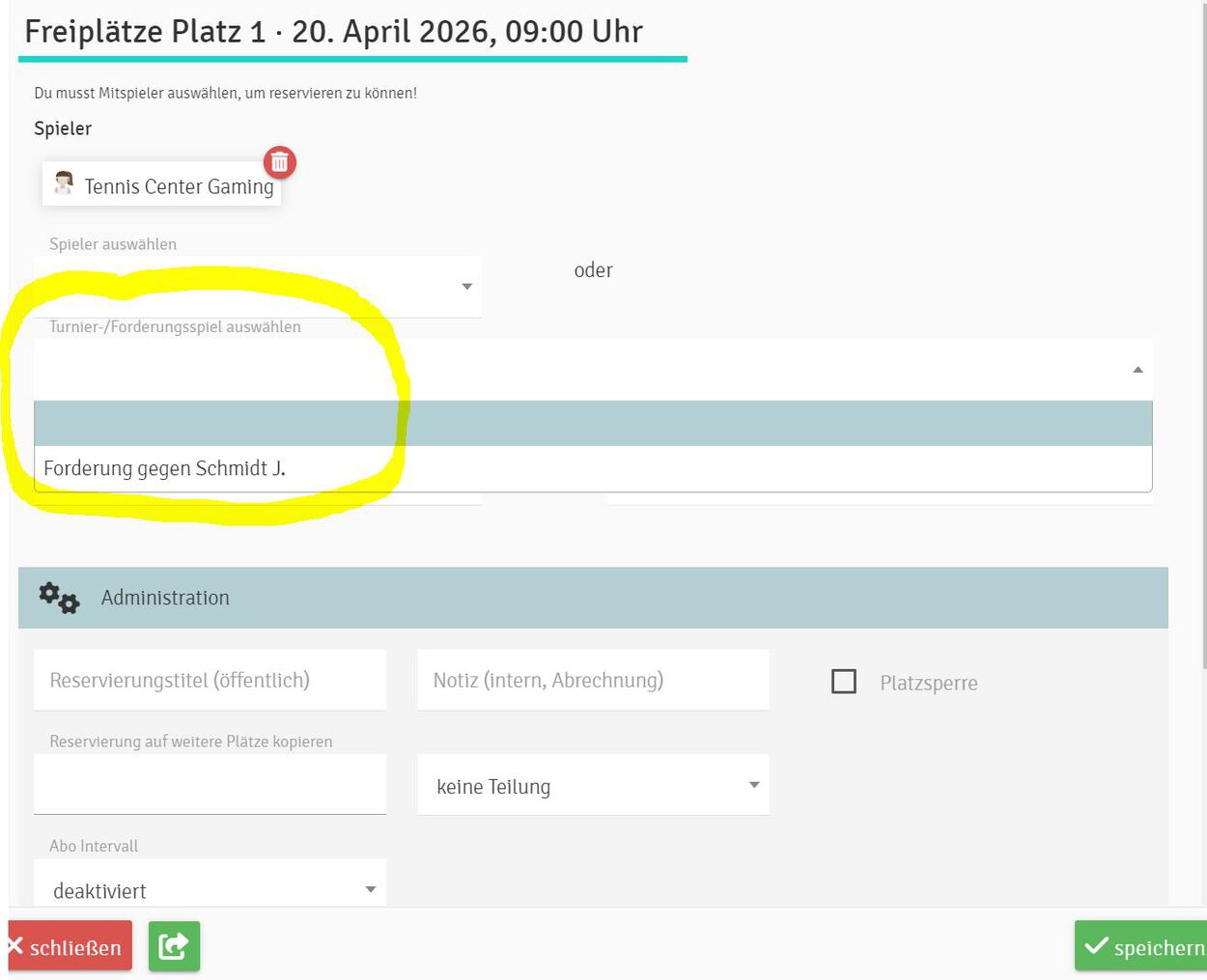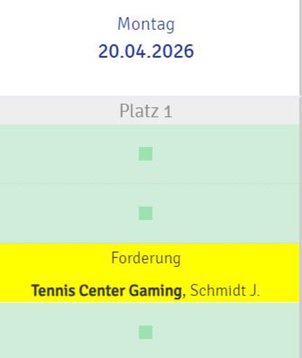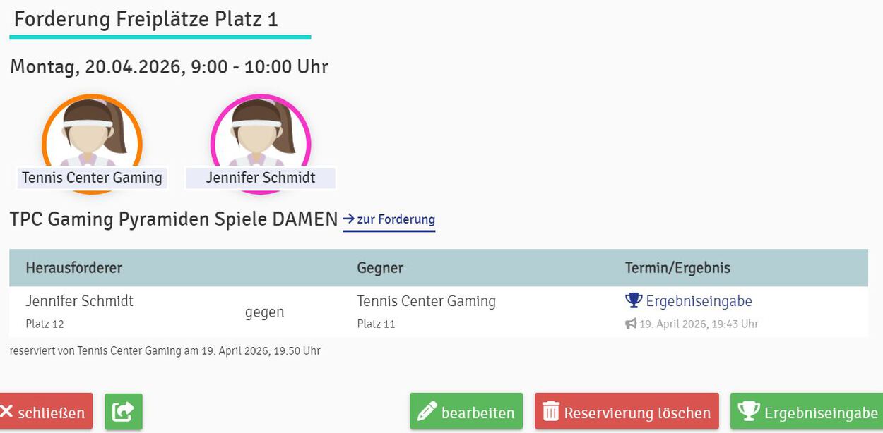 2. Platz RESERVIEREN als Forderung. Platzreservierung ist dann online ersichtlich als Forderungsspiel.